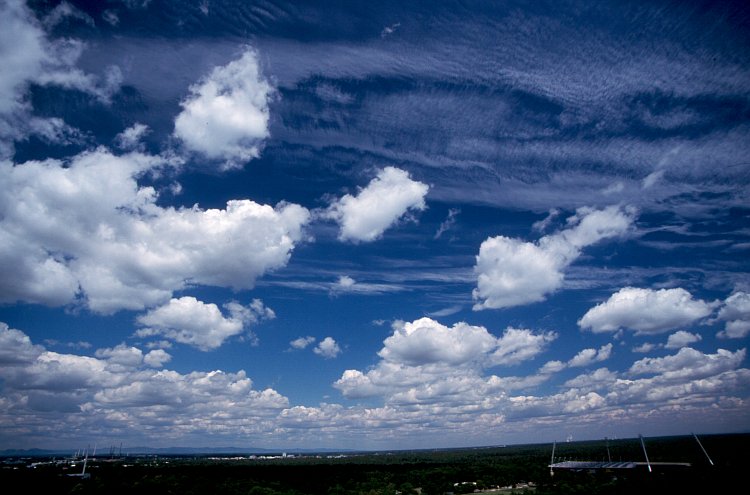 Cumulus humilis, Cumulus fractus, Cirrocumulus stratiformis perlucidus undulatus (Cu hum, Cu fra, Cc str pe un) |